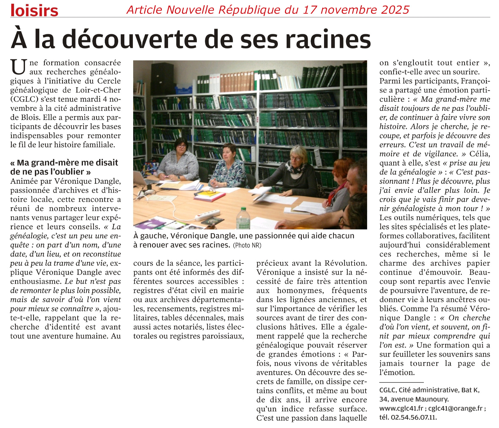 Nouvelle République novembre 2019 : Entre passionnés de généalogie